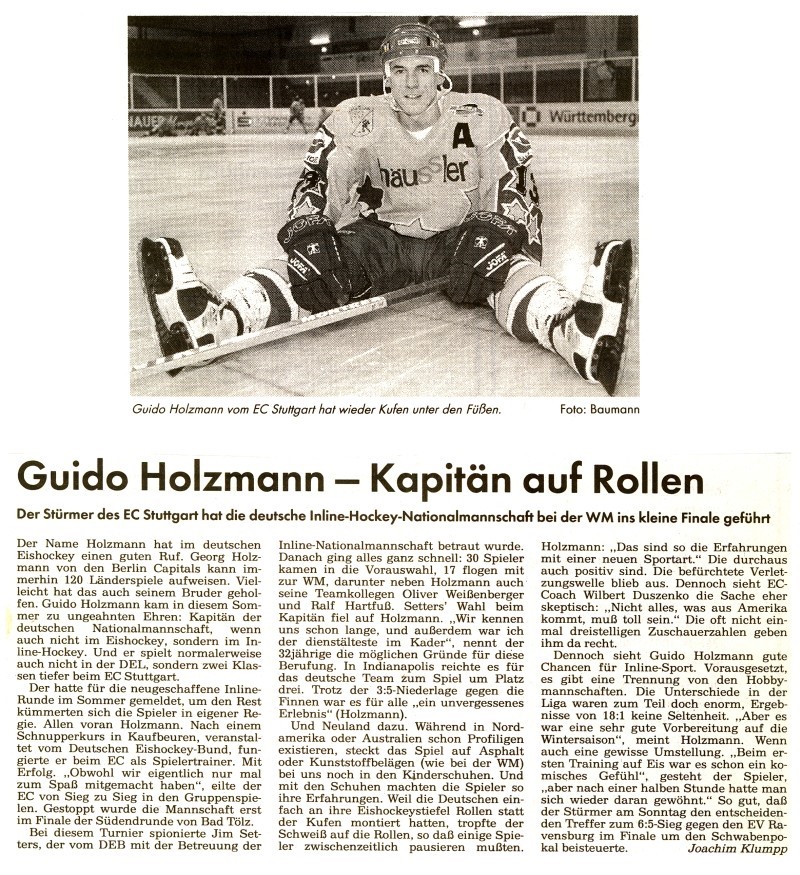 Ein Pfrontner kommt selten allein, weswegen im Jahr darauf sein Bruder Guidl Holzmann nach Stuttgart wechselte. Guidl der seinem Bruder Georg Holzmann („Eisenschorsch“) zum Verwechseln ähnlich sieht, ist ebenfalls in Stuttgart beruflich erfolgreich geworden und blieb vor Ort. Guidl selbst kam 1995 vom damaligen Zweitligisten ETC Crimmitschau nach Stuttgart (Stationen zuvor: EV Pfronten, EC Hedos München, EHC 80 Nürnberg, EV Füssen, EA Kempten). Er war durch seine gesellige und professionelle Art sofort der Liebling von Mitspielern, Funktionären und Fans. Natürlich brachte er auch die Referenz von 23 Toren und 42 Assists in 44 Spielen aus der 2.Liga mit. Nach der Insolvenz des EC Stuttgart wechselte er für die restliche Saison zum Dauerrivalen SC Bietigheim wo er in 10 Spielen mit 5 Toren und 7 Assists seinen Anteil an der 2. Liga Meisterschaft der Steelers hatte. Seine beeindruckende Scorerbilanz (nur aus der 2. Liga und Oberliga) spricht für sich: in 523 Spielen erzielte er 245 Tore und gab 242 Vorlagen. Sein persönliches Highlight war die Teilnahme an der Inlinehockey-Weltmeisterschaft 1996 in den USA (Minneapolis), bei der er die deutsche Mannschaft als Kapitän anführen durfte. Der gelernte Physiotherapeut war beruflich bereits in Stuttgart verankert (Rehamed / Stgt.- Vaihingen), weswegen er sich auch auf Bitten von Christa Tritschler gerne bereit erklärte, mit einem Großteil der alten Stuttgarter 2.Liga Garde beim Neuaufbau der Stuttgart Wizards in der Landesliga zu helfen. Mit seinem kongenialen Sturmpartner Venci Niesner, der leider am 24.12.2025 verstorben ist waren die beiden nicht zu stoppen. Nach 34 Spieltagen verbuchte Guidl sage und schreibe 99 Punkte und hatte maßgeblich Anteil daran, dass der Aufstieg 1999 mit 34:0 Punkten (344:17 Tore) besiegelt wurde. Der Kontakt zu Doc Reichmann brachte Guido Holzmann beruflich auch zum VFB Stuttgart. Mit der goldenen Generation des Clubs durfte er als zuständiger Physiotherapeut bei den A-Junioren nach einem 5:2 gegen Bayer Leverkusen die deutsche A-Jugend Meisterschaft mitfeiern. Spätere Weltklassespieler wie Samy Khedira, Mario Gomez oder Christian Gentner gingen durch seine magischen Hände. Die Fans hatten auch eine Song für Ihn kreiert: Guido Holzmann Eishockeygott, schallte es regelmäßig durch die Halle. Leider musste er bald einsehen, dass ein zeitintensiver Sport wie Eishockey und eine eigene Physiotherapiepraxis dauerhaft nicht miteinander zu vereinbaren sind. Mit seiner sehr erfolgreichen Praxis in Stuttgart ist er auch heute noch eine glühender Unterstützer der Stuttgarter Eishockeytradition und immer gut für eine Anekdote aus der vergangenen Eishockeyära in Stuttgart.